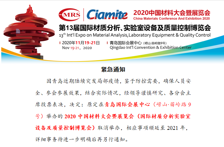 因青島近期陸續(xù)突發(fā)局部疫情,鑒于防控需要,確保人員安全、參會參展效果,結(jié)合實際情況,經(jīng)領(lǐng)導(dǎo)謹慎研究、各分會主席投票表決,決定:原定在青島國際會展中心(嶗山·苗嶺路9號)舉辦的2020中國材料大會暨展覽...