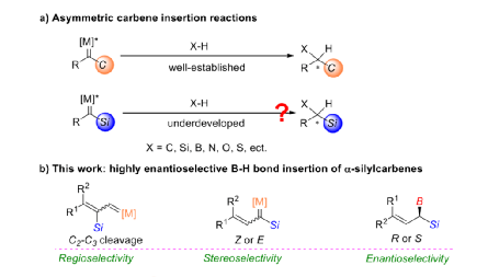 近日,南開大學化學學院朱守非課題組開發(fā)了銅(I)/手性雙噁唑啉絡合物催化以1-甲硅烷基環(huán)丙烯為前體的α-甲硅烷基α-乙烯基卡賓的不對稱B-H鍵插入反應,并能以高收率和對映選擇性得到一系列手性γ,γ-二...