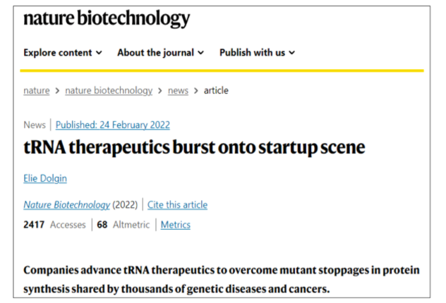 2022年2月24日,國際生物技術權威期刊《Nature Biotechnology》發(fā)表 “tRNA therapeutics burst onto startup scene”的新聞評論[1],講...