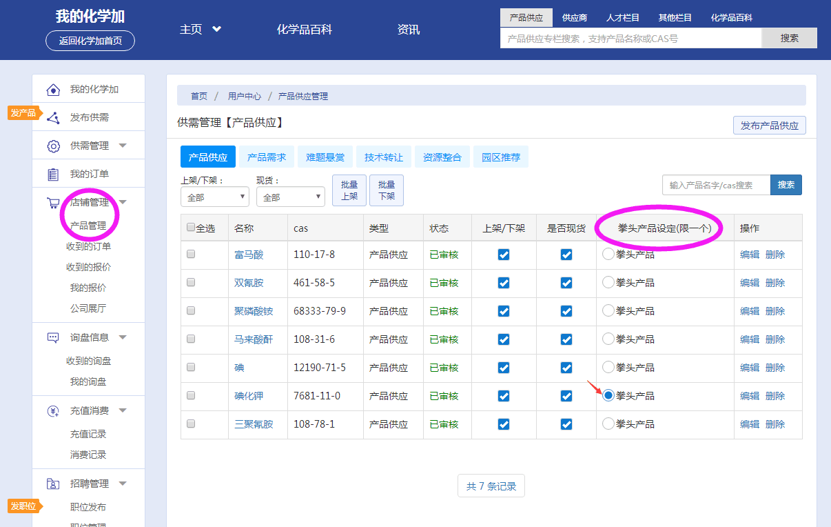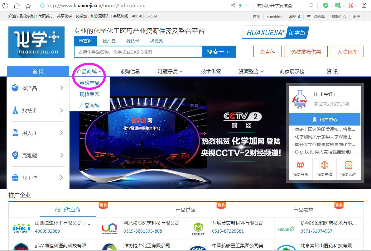 步驟三:設(shè)定好拳頭產(chǎn)品之后,返回化學(xué)加首頁。將鼠標(biāo)移動到“產(chǎn)品商城”上,會顯示下拉菜單,點擊“拳頭產(chǎn)品”進(jìn)入。