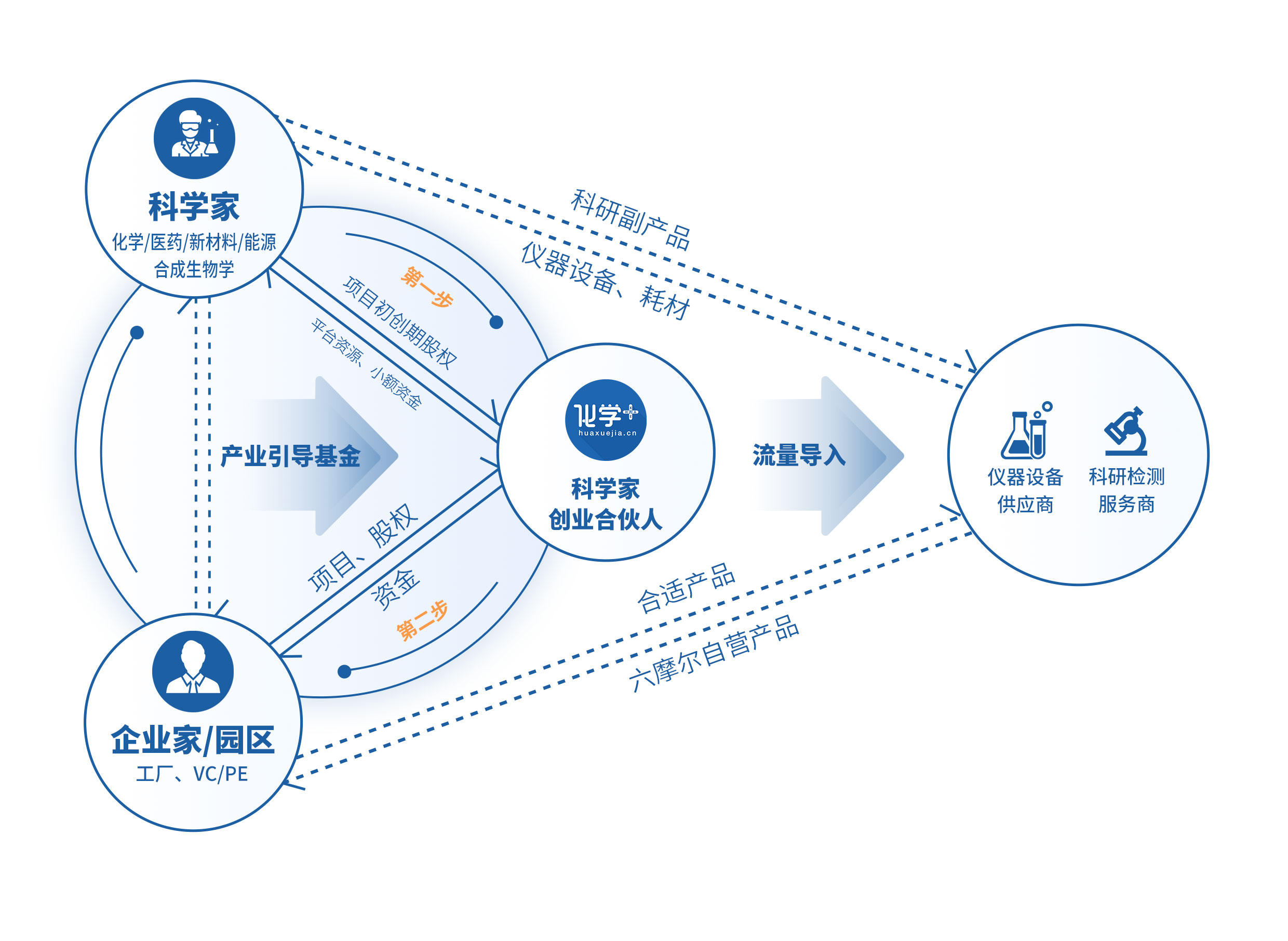 作為科學(xué)家創(chuàng)業(yè)合伙人這一角色,在科學(xué)家的橫向研究、創(chuàng)業(yè)項(xiàng)目、創(chuàng)業(yè)公司初始階段,化學(xué)加可以起到關(guān)鍵的角色互補(bǔ)作用,為項(xiàng)目、為科學(xué)家提供包括市場(chǎng)調(diào)研、企業(yè)需求對(duì)接、融資對(duì)接、園區(qū)入駐、品牌營(yíng)銷(IP打造)、人才推薦等服務(wù)。