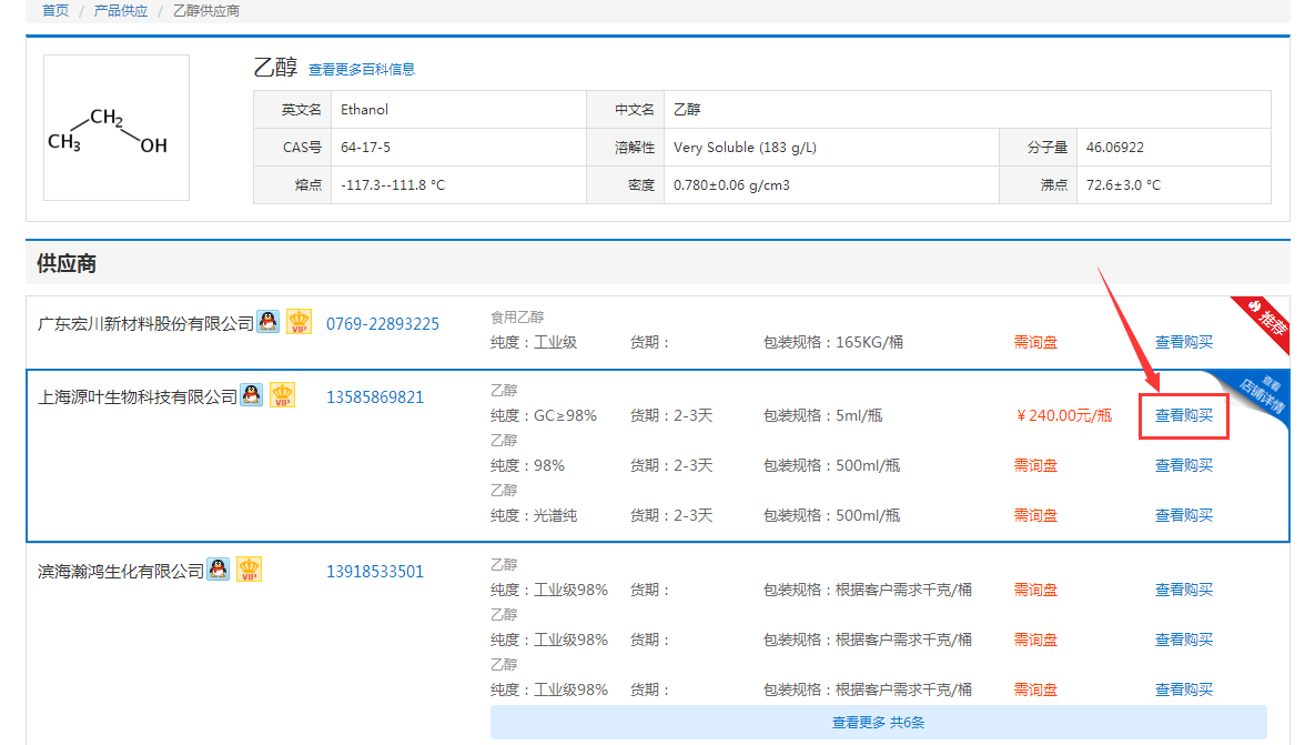 步驟一:登錄化學(xué)加網(wǎng)之后,在搜索欄“找產(chǎn)品”一項(xiàng),輸入您要尋找的產(chǎn)品中文名或者CAS號(hào),搜索結(jié)果出來后,點(diǎn)擊結(jié)果右側(cè)的“查看賣家”,如圖所示。