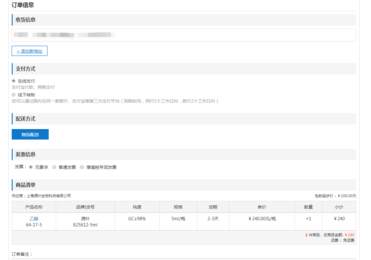 步驟四:填寫好收貨地址,選擇支付方式、發(fā)票信息等,確認(rèn)商品清單,最后點(diǎn)擊確認(rèn)訂單即可。在確認(rèn)了您付款給了化學(xué)加網(wǎng)之后,我們會(huì)盡快提醒賣家發(fā)貨,填寫物流信息。等到您收到貨之后,沒有產(chǎn)品質(zhì)量問題等,請(qǐng)?jiān)俅蔚卿浕瘜W(xué)加網(wǎng)確認(rèn)收貨,我們會(huì)將款打給賣家。