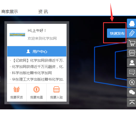 步驟一:登錄后,進(jìn)行產(chǎn)品發(fā)布有以下兩種方式:1、可以通過(guò)點(diǎn)擊首頁(yè)右方便捷欄的第二個(gè)按鈕“快速發(fā)布”,如圖所示。