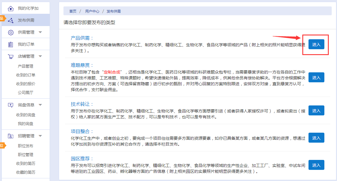 2、可以先進(jìn)入用戶中心,在用戶中心,點(diǎn)擊左側(cè)菜單欄的“發(fā)布供需”。通過(guò)以上兩種方式,您都將看到以下頁(yè)面,點(diǎn)擊產(chǎn)品供需的“進(jìn)入”按鈕即可。需要發(fā)布其他信息,在此頁(yè)面,點(diǎn)擊相應(yīng)的“進(jìn)入”按鈕即可。