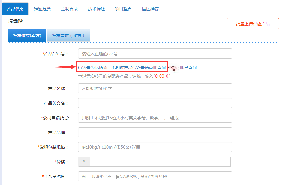 步驟二:在發(fā)布產(chǎn)品的頁(yè)面,按照填寫提示來(lái)發(fā)布產(chǎn)品。其中,帶*的為必填項(xiàng)目,其余為選填項(xiàng)目,建議都填寫完整并上傳圖片。CAS號(hào)不知道的,可以點(diǎn)擊查詢按鈕去化合物百科查詢,復(fù)配類的填寫0-00-0。如圖所示。價(jià)格變動(dòng)大的,可以填寫0,會(huì)顯示為需詢盤。請(qǐng)勿填寫虛假信息,遭到舉報(bào),化學(xué)加網(wǎng)有權(quán)將您產(chǎn)品下架,企業(yè)加入黑名單中。
