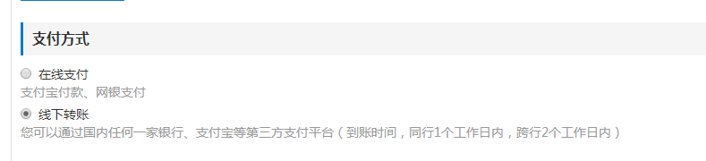在確認(rèn)訂單頁面,有兩種支付方式選擇。在線支付可以選擇支付寶付款或者網(wǎng)銀支付。金額較大的,超過支付寶或網(wǎng)銀限額的,請選擇線下轉(zhuǎn)賬。
