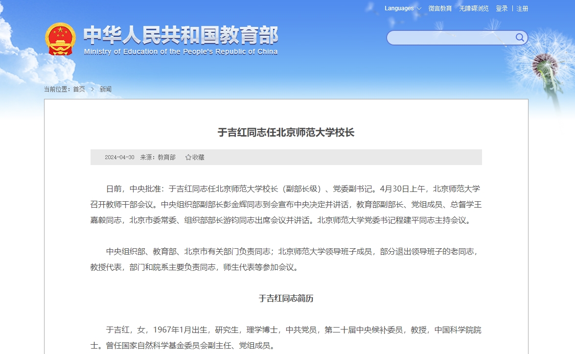 日前,中央批準:于吉紅同志任北京師范大學校長(副部長級)、黨委副書記。4月30日上午,北京師范大學召開教師干部會議。中央組織部副部長彭金輝同志到會宣布中央決定并講話,教育部副部長、黨組成員、總督學王嘉...