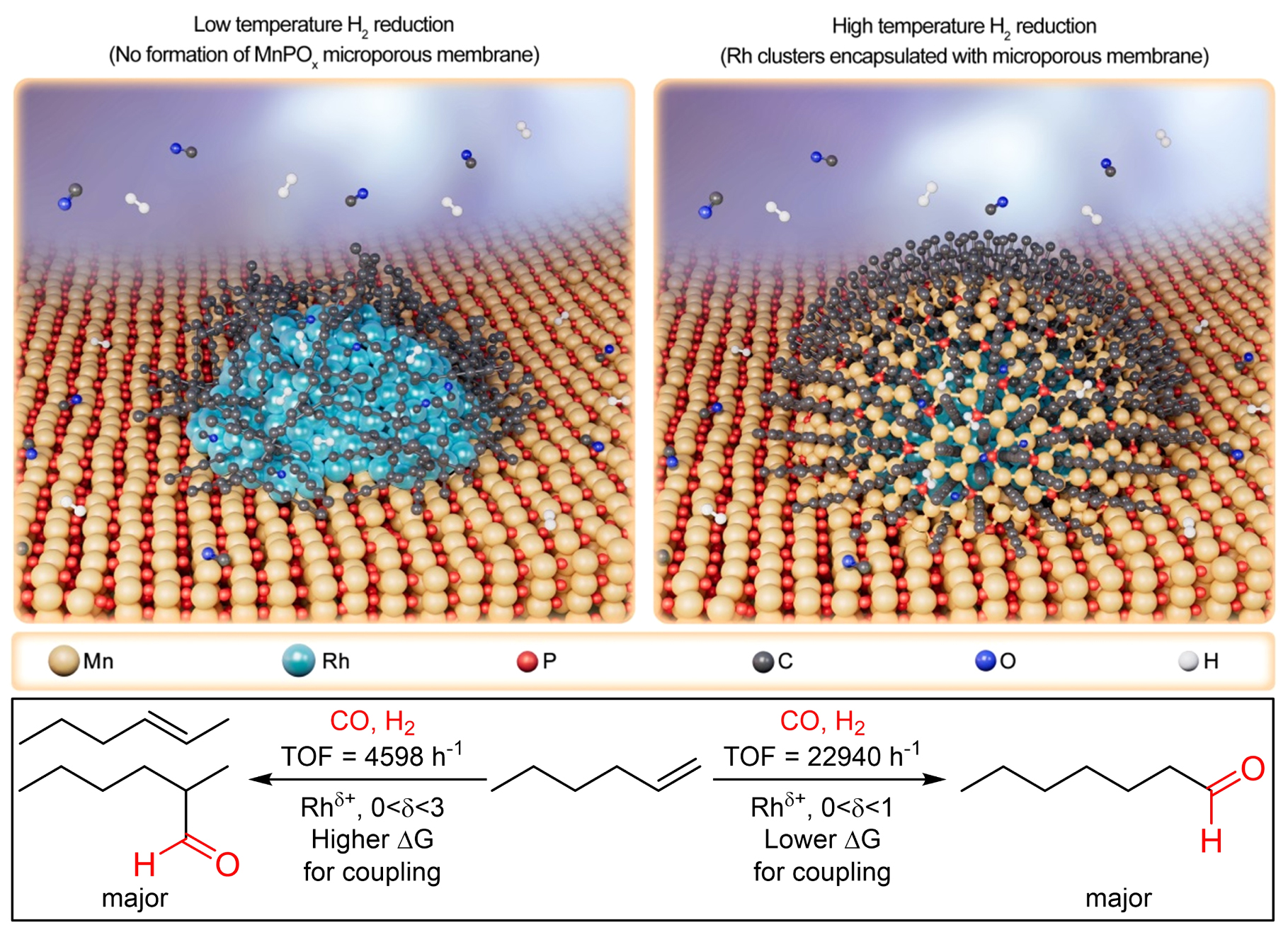 江南大學(xué)化工學(xué)院劉小浩教授團(tuán)隊(duì)采用浸漬法將乙酰丙酮銠負(fù)載到Mn2P2O7載體上,基于可控H2還原觸發(fā)載體中的磷(P)活化,從而實(shí)現(xiàn)了MnPOx物種向Rh團(tuán)簇表面的定向遷移,形成的MnPOx微孔膜(孔尺...