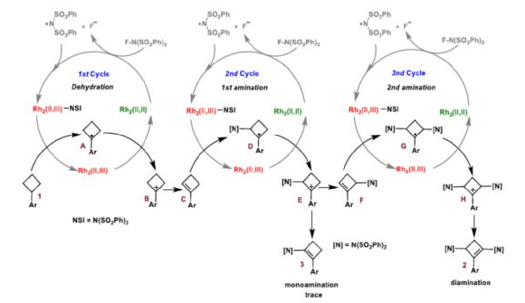 近日,四川大學(xué)王元樺課題組報(bào)道了一種銠(II)催化芳基環(huán)丁烷C(sp3)-H鍵的雙胺化反應(yīng),其中市售的N-氟代苯磺酰亞胺(NFSI)為氧化劑和氮源,涉及多個(gè)連續(xù)的氧化自由基-極性交叉(ORPC)和去飽...