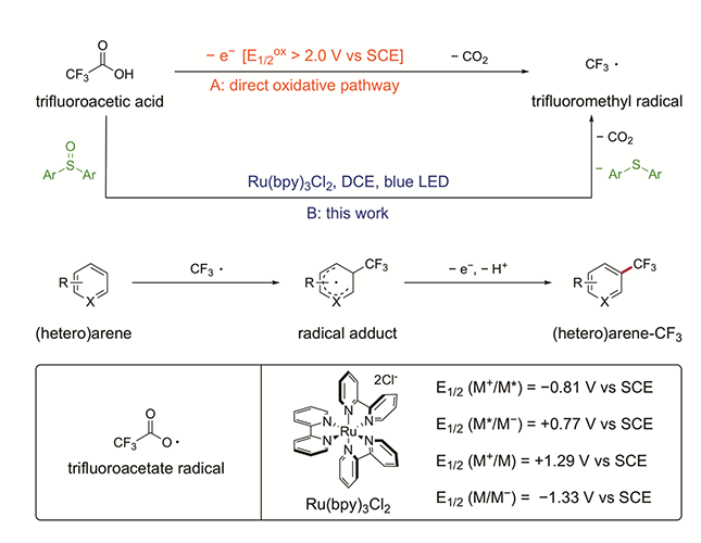 中國(guó)科學(xué)院上海有機(jī)化學(xué)研究所天然產(chǎn)物有機(jī)合成化學(xué)重點(diǎn)實(shí)驗(yàn)室金健課題組近期在芳烴的三氟甲基化研究中取得新進(jìn)展(圖1)。光氧化還原催化與芳基亞砜的結(jié)合,為三氟甲基自由基以及類似自由基的產(chǎn)生提供了新的途徑(...
