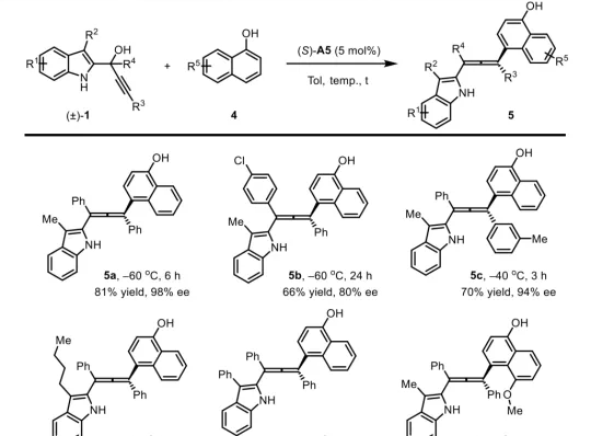 香港科技大學(xué)孫建偉課題組報道了手性磷酸催化吲哚取代的炔丙醇與3-苯基吲哚或1-萘酚的不對稱1,8-共軛加成反應(yīng),能以良好至優(yōu)秀的收率及對映選擇性得到一系列四取代聯(lián)烯化合物。同時,對照實驗的結(jié)果表明遠(yuǎn)程...