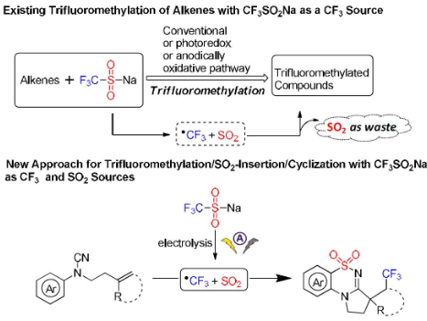 三氟甲基取代的有機氟化合物在醫(yī)藥、農(nóng)藥、材料等領(lǐng)域具有廣泛應(yīng)用。因此,發(fā)展高效、實用的合成方法制備三氟甲基取代的有機化合物具有重要的研究價值。Langlois試劑(CF3SO2Na)作為一類重要的三氟...