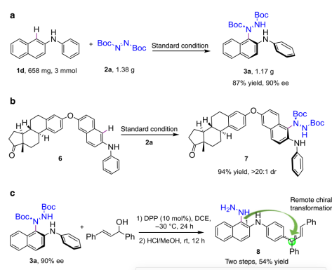 上海交通大學(xué)張書(shū)宇團(tuán)隊(duì)開(kāi)發(fā)了手性磷酸催化N-芳基-2-萘胺與偶氮二羧酸酯的分子間不對(duì)稱C-H胺化反應(yīng),能以良好至優(yōu)秀的收率和對(duì)映選擇性得到一系列非二芳基N-C軸手性化合物,其中該報(bào)道使用了π-π相互作...