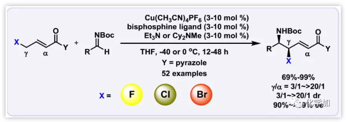 近日,中國科學(xué)院上海有機(jī)化學(xué)研究所殷亮研究員課題組在J. Am. Chem. Soc.報(bào)道了Cu(I)-催化的直接不對稱插烯γ-鹵素(F, Cl或Br)-α,β-不飽和N-?;吝蚝蚇-Boc-醛亞胺...