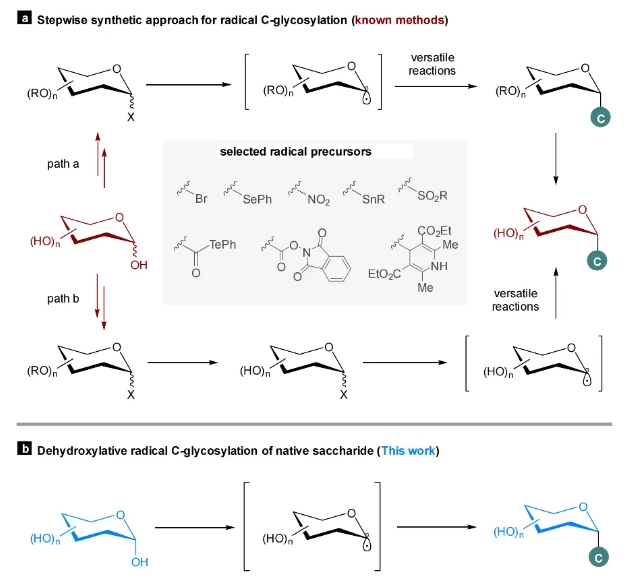 近日,蘭州大學舒興中教授課題組提出了一種通過天然糖苷C?OH鍵均裂生成糖基自由基的新方法,該方法利用鈦催化劑,可直接從天然糖生成糖基自由基,這些自由基與活性烯烴選擇性偶聯(lián),從而高效生成具有高立體選擇性...