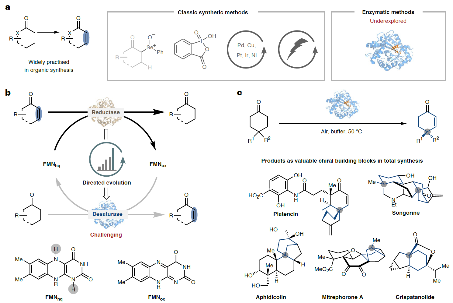 西湖大學葉宇軒課題組從一類底物范圍好、熱穩(wěn)定性高、易于表達的烯還原酶出發(fā),成功把其從還原酶改造成去飽和化酶 (圖1b),建立了一個通用的酶催化羰基去飽和化反應(yīng)平臺,合成了一系列含有遠端四級手性中心的高...