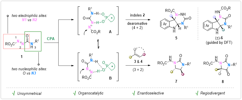 近日,鄭州大學梅光建課題組報道了新型雙功能胺化試劑偶氮脲(azocarboxamides , ACAs),并利用不同氮源部分反應(yīng)性的區(qū)別實現(xiàn)對多種富電子碳碳雙鍵的有序雙胺化,構(gòu)建出多種手性的非對稱鄰二...