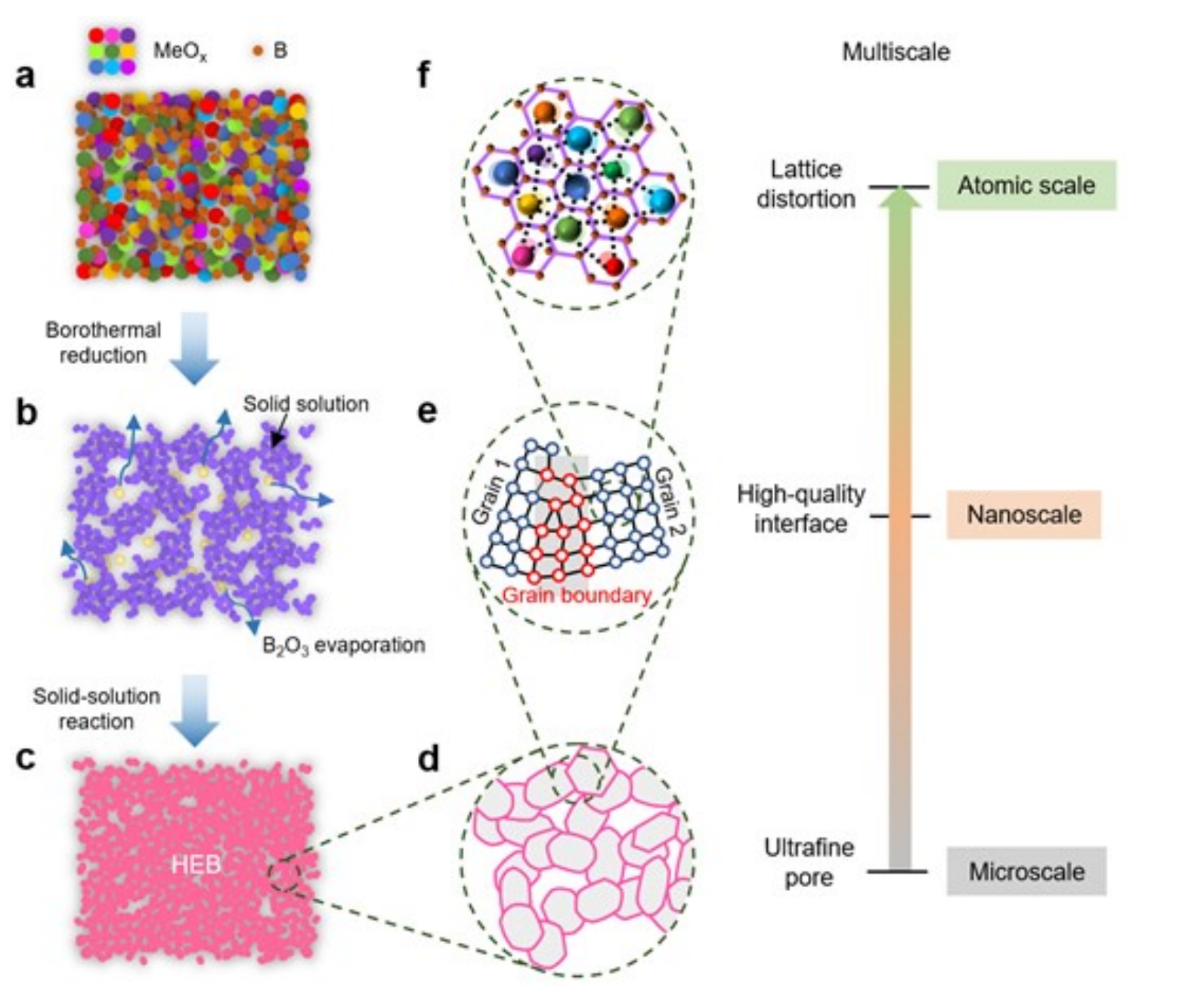 近日,華南理工大學(xué)褚衍輝、莊磊合作報道了一種多尺度結(jié)構(gòu)設(shè)計和快速制備的9元陽離子多孔高熵二硼化物陶瓷,通過超快速高溫合成技術(shù),可以實現(xiàn)卓越的機械承載能力和高熱絕緣性能。通過構(gòu)建涉及微尺度超細孔、納米尺...