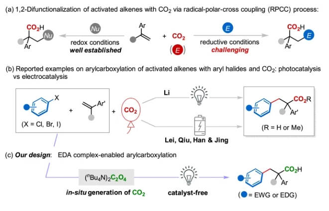 以廉價易得的CO2為C1源,通過烯烴的芳羧基化反應合成功能化羧酸是一種十分綠色高效的策略。通過自由基極性交叉偶聯(lián)(RPCC)策略實現(xiàn)CO2參與的烯烴雙官能化反應已經(jīng)被很多課題組研究并報道。然而,當使用...
