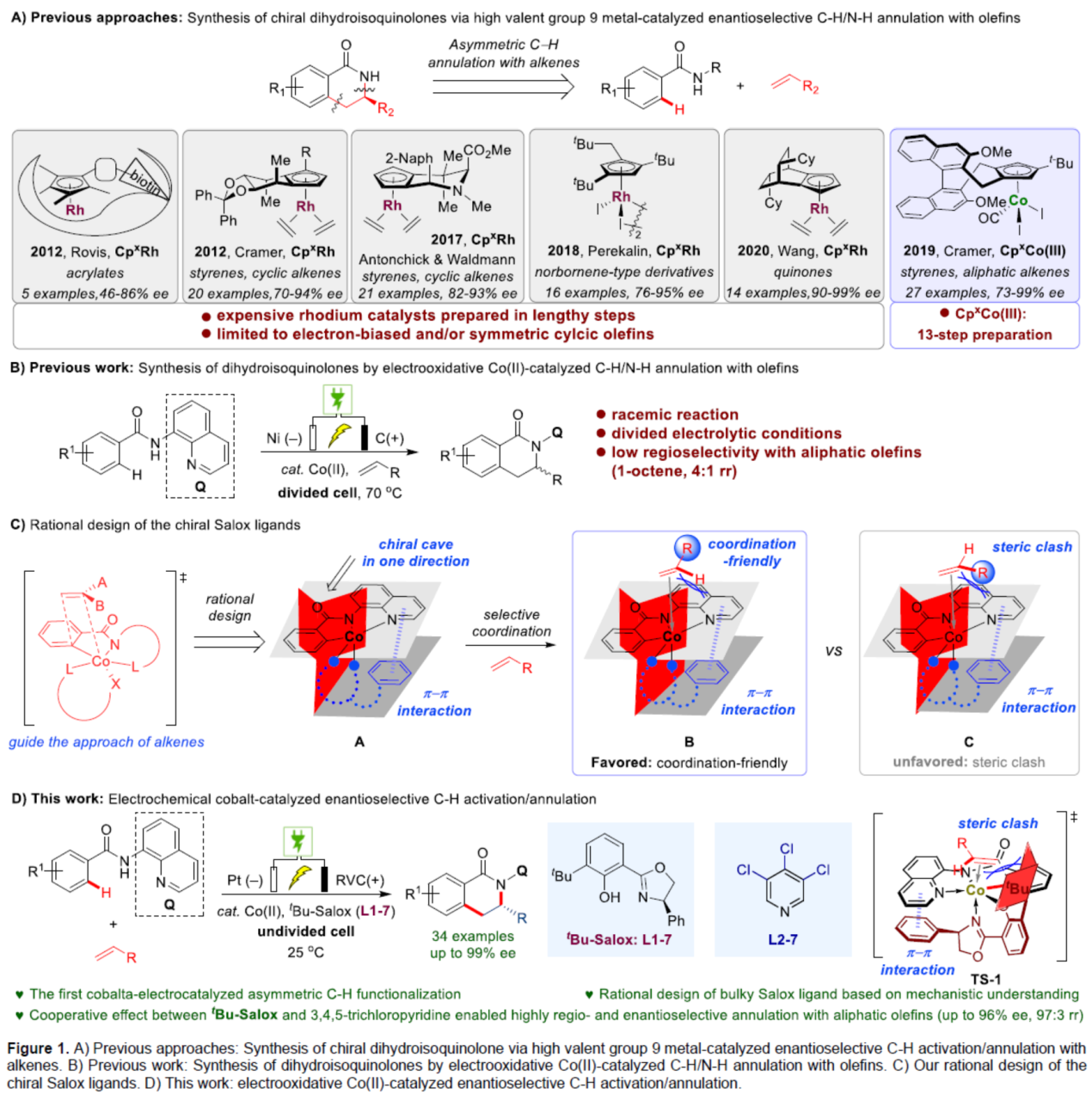 近日,浙江大學史炳鋒課題組首次報道了一種電氧化鈷催化烯烴的對映和區(qū)域選擇性C-H/N-H環(huán)化反應。其中,在簡單的非分隔電解槽中室溫下反應,可獲得高達99%ee的產物。其次,在苯酚的鄰位帶有一個位阻較大...