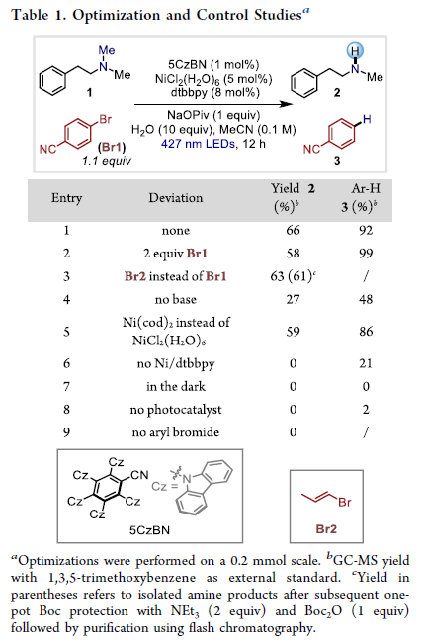 近日,美國哥倫比亞大學(Columbia University)Tomislav Rovis課題組發(fā)展了新的光誘導、鎳催化的選擇性N-去甲基化方法。其使用芳基或烯基溴作為C(sp2)自由基源(氫原子轉...