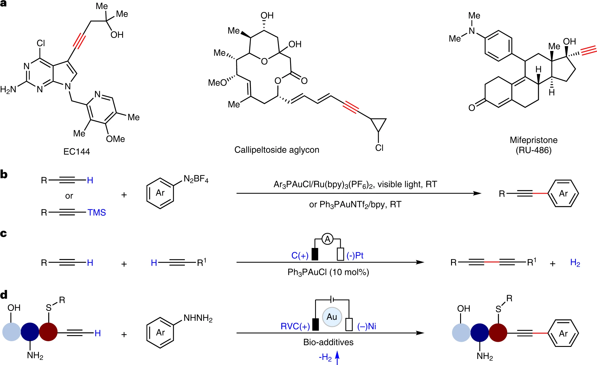 近日,南京大學(xué)的謝勁團(tuán)隊(duì)報道了一種溫和條件下,結(jié)合電氧化還原策略與雙核金催化實(shí)現(xiàn)的端炔與芳基肼C(sp2)-C(sp)偶聯(lián)反應(yīng),該反應(yīng)具有優(yōu)異的官能團(tuán)兼容性和生物相容性。他們以芳基肼為芳基自由基源,其...