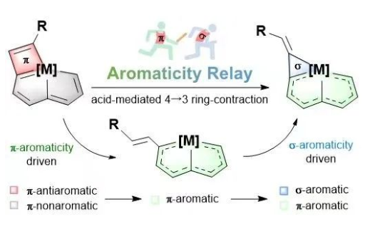 近日,夏海平教授/林玉妹副教授在“碳龍化學(xué)”領(lǐng)域再次取得重要進(jìn)展:提出了一種基于π-和σ-芳香性接力驅(qū)動(dòng)的策略,實(shí)現(xiàn)了首例金屬雜環(huán)丁二烯到金屬雜環(huán)丙烯的縮環(huán)反應(yīng)。相關(guān)成果以“Ring Contract...
