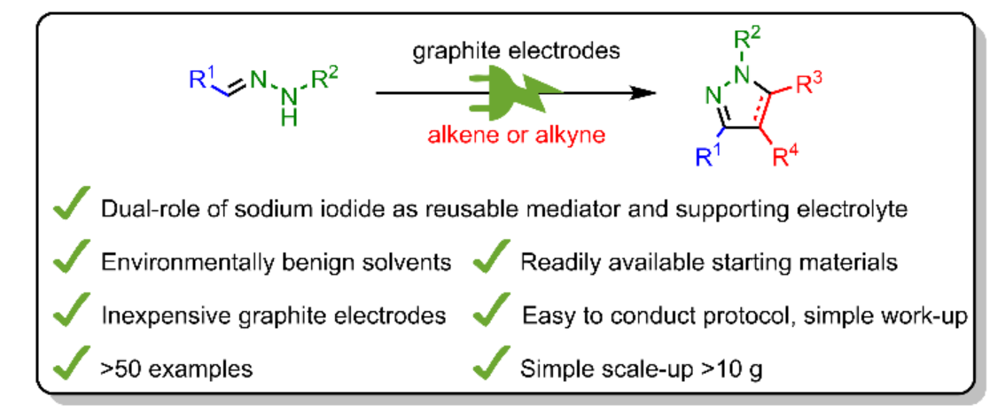 近日,德國(guó)美因茨大學(xué)Siegfried R. Waldvogel課題組首次報(bào)道了一種腙與親偶極體(dipolarophiles)的直接電化學(xué)方法,涉及[3+2]偶極環(huán)加成的過(guò)程,合成了一系列吡唑啉和吡...
