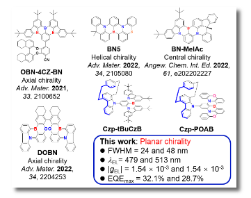 近日,南京大學(xué)化學(xué)化工學(xué)院鄭佑軒教授和鄭文華副教授團(tuán)隊(duì)將[2.2]對(duì)環(huán)(1,4)咔唑啉(Czp)引入到基于叔丁基和酚惡嗪的硼氮多重共振體系中,合成了兩對(duì)具有平面手性的CP-MR-TADF對(duì)映體 (R/...