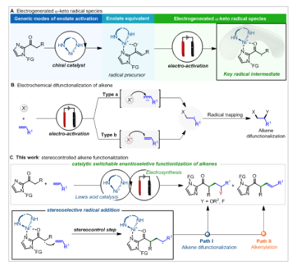 近日,中國科學(xué)技術(shù)大學(xué)合肥微尺度物質(zhì)科學(xué)國家研究中心郭昌教授研究團隊實現(xiàn)了電化學(xué)催化不對稱自由基型烯烴雙官能團化、烯基化和烯丙基官能團化反應(yīng)。相關(guān)成果分別以“Nickel-catalyzed swit...