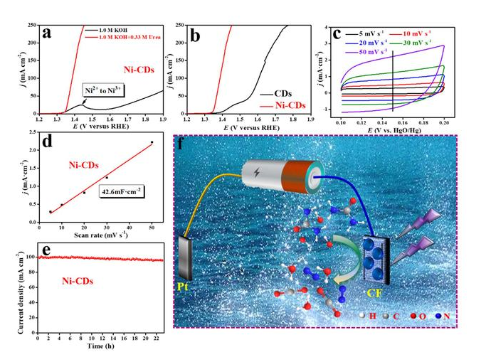 近日,安徽大學(xué)材料科學(xué)與工程學(xué)院畢紅教授課題組首次采用金屬鎳摻雜碳點(diǎn)(Ni-CDs)作為尿素電氧化的催化劑。相關(guān)成果以《Nickel-doped carbon dots as an efficient...