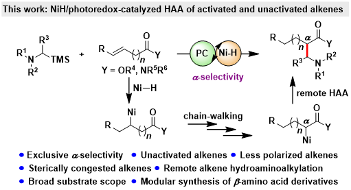 近日,華中科技大學(xué)袁偉明課題組報道了通過可見光/鎳氫協(xié)同催化策略實現(xiàn)了烯烴的氫氨烷基化反應(yīng),且具有優(yōu)異的α-選擇性,該方法與傳統(tǒng)Giese加成反應(yīng)只能獲得β-選擇性形成優(yōu)勢互補。并且借助NiH“鏈行走...