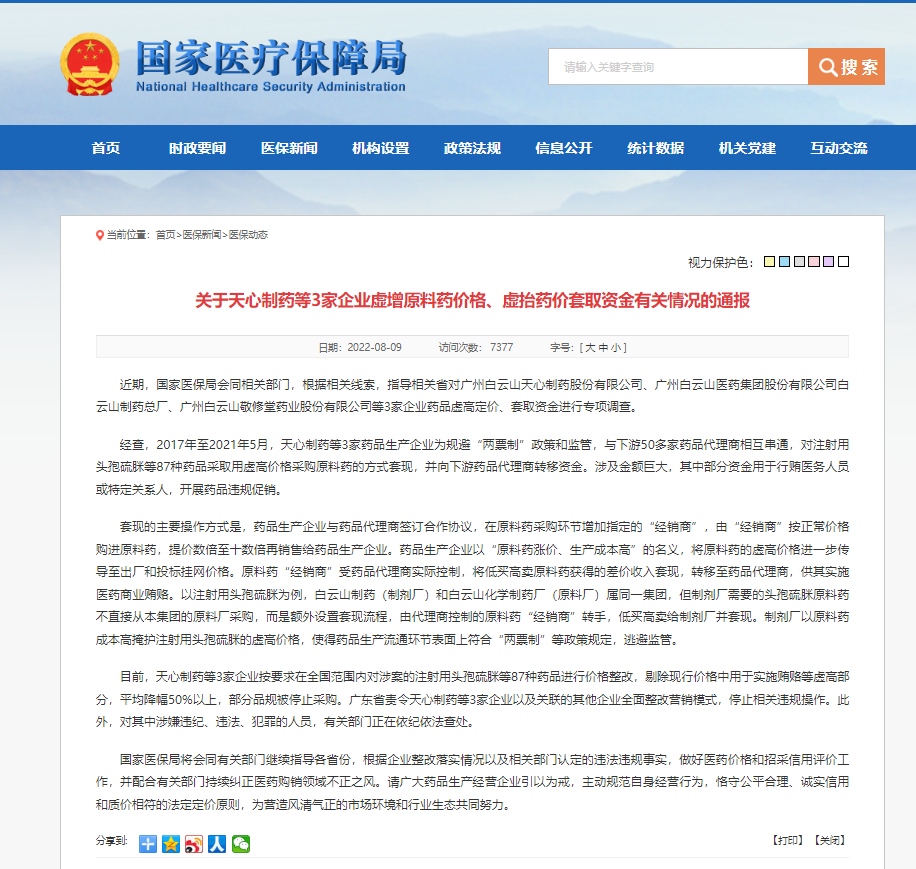 近期,國(guó)家醫(yī)保局會(huì)同相關(guān)部門,根據(jù)相關(guān)線索,指導(dǎo)相關(guān)省對(duì)廣州白云山天心制藥股份有限公司、廣州白云山醫(yī)藥集團(tuán)股份有限公司白云山制藥總廠、廣州白云山敬修堂藥業(yè)股份有限公司等3家企業(yè)藥品虛高定價(jià)、套取資金進(jìn)...