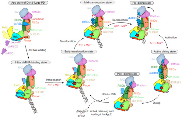Nature:復(fù)旦大學(xué)麻錦彪團隊合作解析果蠅Dicer-2結(jié)合雙鏈RNA加工生成siRNA的分子機制