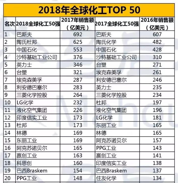 2018全球化工50強(qiáng)榜單企業(yè)大起底,巴斯夫依然雄踞榜首,萬(wàn)華化學(xué)上榜