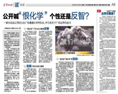 中央電視臺(tái)8套播某集團(tuán)旗下“法×琳卡”15秒“我們恨化學(xué)”廣告,因代言明星連續(xù)重復(fù)喊叫了三次“我們恨化學(xué)”,引起北京大學(xué)84歲教授周公度在內(nèi)的眾多化學(xué)界人士的不滿, 周在“狀告書”中稱“這是一則反科學(xué)...