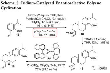 首先,利用苯乙烯16與9-BBN反應(yīng)得到硼酸酯中間體,然后在Pd催化下與乙烯基碘17進(jìn)行Suzuki偶聯(lián)得到18,進(jìn)一步處理脫去TBS得到多烯15。隨后,利用Carreira等人報道的反應(yīng)條件探索了Lewis酸作用下銥催化的對映選擇性多烯環(huán)化,并發(fā)現(xiàn)在20 mol%Zn(OTf)2存在情況下,環(huán)化收率可以達(dá)到73%(99.6%ee)。