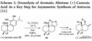在2015年,作者曾開發(fā)出一種簡潔的不對稱合成方法,將松香烷(+)-carnosic acid(9)中富電子的酚進(jìn)行臭氧分解得到中間10,再經(jīng)四步反應(yīng)合成(-)-antrocin(11)(Scheme 3)。作者擬以串聯(lián)多烯環(huán)化和苯酚臭氧分解作為關(guān)鍵步驟,進(jìn)行insulicolide A的不對稱全合成,并希望開發(fā)的方法可以適用于其他家族成員的全合成。