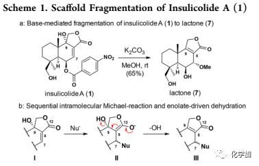 在溫和堿性條件下,利用K2CO3/MeOH可將1轉(zhuǎn)化成內(nèi)酯7,表明1在C-7位易于進(jìn)行親核加成導(dǎo)致在C-9處羥基消除得到甲醚7,這可能是通過Michael加成和烯醇化脫水產(chǎn)生的(b in Scheme 1)。