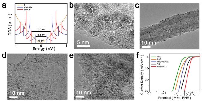 圖1. (a) 石墨烯,多壁碳納米管和單壁碳納米管的電子態(tài)密度。(b, c, d, e, f) Rh/SWNTs, Rh/MWCNTs, Rh/G和Rh/C的TEM圖和酸性HER性能。