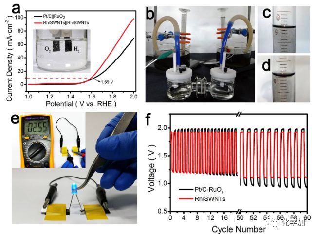 不僅于此,Rh/SWNTs界面處較高的電子密度還可顯著提升其ORR性能,并且由于Rh外層電子發(fā)生極化使其更易于被氧化成為高價氧化物,進(jìn)而還提升了材料的OER性能并與商業(yè)化RuO2相當(dāng)。最后,基于Rh/SWNTs良好的三功能性能,作者直接將其應(yīng)用至全水分解的陰極和陽極,在1 M KOH中僅需1.59 V就可達(dá)到電流密度為10 mA cm-2,此外,還可將其作為空氣電極應(yīng)用至自主裝鋅-空氣電池中,兩節(jié)電池直接串聯(lián)就可達(dá)到2.55 V的電壓。(圖3)