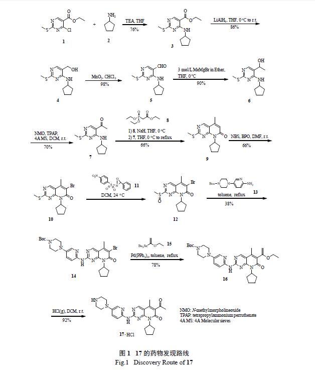 用于治療HR+/HER2- 晚期乳腺癌,第一年即實現(xiàn)了7.23 億美元的銷售額,2016 年上半年全球銷售額達到9.42 億美元,預(yù)計全年銷售額可達23 億美元,已成為名副其實的“重磅炸彈”新藥。該藥物發(fā)現(xiàn)的初始路線( 圖1) 是從4- 氯-2- 甲硫基嘧啶-5- 甲酸乙酯(1) 出發(fā),經(jīng)過7 步反應(yīng)構(gòu)建溴代吡啶并嘧啶酮母核中間體10,然后經(jīng)過特別的氧化劑11 處理,得到了關(guān)鍵中間體亞砜12,隨后的親核取代反應(yīng)連接氨基吡啶13,接著在Pd(PPh3) 4催化下,利用Still 偶聯(lián)反應(yīng)制備了烯醇醚16,經(jīng)鹽酸酸性水解除去保護基,獲得了17 的鹽酸鹽。該路線共涉及11 步反應(yīng),總收率僅4.8% [7]。