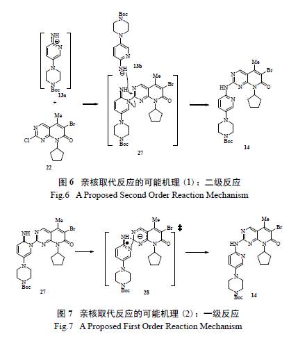 HOMO 的計算也表明,在中性條件下,化合物13a 中吡啶環(huán)上的氮和環(huán)上的氨基有大致相同的親核活性,許多情況下,產(chǎn)生區(qū)域異構(gòu)體27 顯然是動力學(xué)上有利生成的。由于環(huán)外的氮有較高的電子云密度,且不易離域化,故通過使用其他的強堿試劑,極有可能形成脫質(zhì)子的氨基負(fù)離子。初步篩選強堿,如NaOtBu, KOtBu, NaOt-Am 可得到約30%~ 40%的理想產(chǎn)物14,但不可避免地帶來水解副產(chǎn)物25。若嚴(yán)格干燥各種試劑并小心處理反應(yīng),可以有效控制雜質(zhì)生成,收率能提高到87%,但在大規(guī)模的放大生產(chǎn)中,完全嚴(yán)格地除水是不現(xiàn)實的。由此,輝瑞研發(fā)團隊決定使用氯化異丙基鎂作為堿參與親核取代反應(yīng),結(jié)果反應(yīng)進行得非常干凈徹底,且未生成二聚體副產(chǎn)物24。當(dāng)13 和格氏試劑摩爾比1.1 ∶ 2 時,收率81%;優(yōu)化后摩爾比調(diào)整為1.3 ∶ 2.2 時,收率提高到94%,但有少量脫溴副產(chǎn)物形成。他們通過在線紅外和離線分析發(fā)現(xiàn)反應(yīng)機理存在2 種可能的途徑:(1) 直接親核取代;( 2) 反應(yīng)機理和前述相同,但可能中間體23 轉(zhuǎn)化為產(chǎn)物14 太快,無法用在線紅外跟蹤檢測。鑒于用氯化異丙基鎂作堿在反應(yīng)過程中會產(chǎn)生異丙烷氣圖6 親核取代反應(yīng)的可能機理(1):二級反應(yīng)Fig.6 A Proposed Second Order Reaction Mechanism圖7 親核取代反應(yīng)的可能機理(2):一級反應(yīng)Fig.7 A Proposed First Order Reaction Mechanism體,在最后的優(yōu)化工藝中,改用氯化環(huán)己基鎂,解決了產(chǎn)生氣體所帶來的安全隱患,已成功應(yīng)用于實際生產(chǎn)。