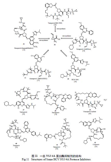 2014 年上市的吉利德史詩級“ 重磅炸彈”NS5B 抑制劑索非布韋( sofosbuvir) 以優(yōu)異的治療效果、廣譜的抗病毒活性、高耐藥屏障以及極低的交叉耐藥可能性,迅速占領(lǐng)了市場,2015 年全年銷售53 億美元,sofosbuvir 和ledipasvir 的復(fù)方Harvoni 全年達139 億美元,創(chuàng)造了銷售奇跡[ 12]。楊森制藥開發(fā)的司美匹韋( simeprevir) 是第二代NS3/4A 抑制劑,它的出現(xiàn)對NS3/4A 抑制劑的開發(fā)是革命性的,不僅表現(xiàn)出對NS3/4 蛋白酶極高的抑制活性[13],而且臨床上與干擾素/ 利巴韋林合用的三聯(lián)療法治愈率極高,12 周的持續(xù)病毒響應(yīng)時間高達88.6%,相對之前的療法有了極大提高,同時治療周期也縮短到12 周。2014 年也創(chuàng)下了年銷售23億美元的佳績。其他一些丙肝NS3/4A 抑制劑的結(jié)構(gòu)見圖11。