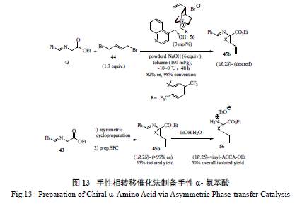 在BI 的工作基礎(chǔ)上,Merck 的工藝化學(xué)家巧妙使用了無需過渡金屬催化的手性相轉(zhuǎn)移催化綠色工藝,用以甘氨酸希夫堿和二溴丁烯為原料的合成方法[25],一步到位構(gòu)筑了含有環(huán)丙烷基和乙烯基的手性α- 氨基酸酯( 圖13)。值得一提的是,通過對反應(yīng)條件的篩選和優(yōu)化( 手性相轉(zhuǎn)移催化劑的用量、堿的選擇、水的用量控制以及反應(yīng)時間和溫度等),取得了較為理想的效果,并結(jié)合制備型手性柱的超臨界流體色譜(SFC) 分離(SFC 是一種提高分離效率的綠色環(huán)保關(guān)鍵技術(shù)),以55%的分離產(chǎn)率、>99% ee 的光學(xué)純度制備了化合物56。