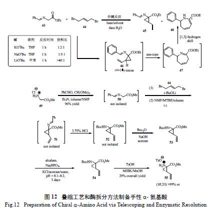 從圖11 來看,這些抑制劑都含有一個共同的手性小分子,即保護的(1R,2S) -1- 氨基-2- 乙烯基環(huán)丙基羧酸,Boehringer-Ingelheim(BI) 的化學(xué)家首先發(fā)展了一種以價廉易得的甘氨酸酯鹽酸鹽為起始原料的簡約方法( 圖12):選擇1,4- 二溴代-2- 丁烯為另一原料,利用串聯(lián)的SN2-SN2' 雙烷基化過程,一步到位極為便利地制備了外消旋的氨基酸。值得一提的是,作為關(guān)鍵反應(yīng),反應(yīng)條件的選擇和優(yōu)化對控制主要副產(chǎn)物48 的形成至關(guān)重要。通過數(shù)十個反應(yīng)條件的仔細(xì)篩選,將理想產(chǎn)物45 與48 的比例從極不理想的1.2 ∶ 1 優(yōu)化至>40 ∶ 1,易于分離純化,也為疊縮工藝(Telescoping Process) 的實施打下了堅實的基礎(chǔ)[24]。