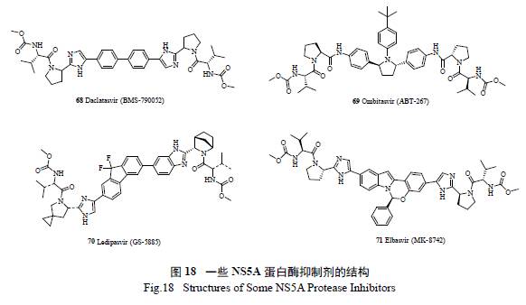 ZEPATIER(Elbasvir / Grazoprevir) 是一款口服丙肝藥物組合[ 其中Elbasvir(71) 是一種NS5A抑制劑[33],Grazoprevir 是一種NS3/4A 蛋白酶抑制劑[34] ] 可有效抑制丙肝病毒的復(fù)制,2016 年1 月28 日被FDA 批準(zhǔn)用于治療慢性丙型肝炎(HCV)基因1 型和4 型感染。該聯(lián)合藥物不需要聯(lián)合使用干擾素,避免了干擾素治療可能產(chǎn)生的嚴(yán)重不良反應(yīng)。預(yù)計2017 年ZEPATIER 的銷售額有望達到15 億美元。圖18 是FDA 批準(zhǔn)上市的NS5A 蛋白酶抑制劑的結(jié)構(gòu)。