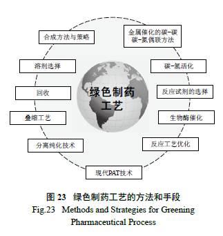 制藥工藝的綠色化是一個復(fù)雜、逐漸優(yōu)化的系統(tǒng)工程( 圖23),是將一系列反應(yīng)有效地“串聯(lián)”起來,從簡單易得的原料來制備復(fù)雜藥物分子的過程。涉及合成化學(xué)單元反應(yīng)的有效連接,是一個“承上啟下”的科學(xué)活動[ 38]。因此,它不僅要考慮合成方法與策略、綠色的手段( 金屬催化的偶聯(lián)反應(yīng)、C-H 活化、生物酶催化),而且追求實現(xiàn)完美工藝的技巧( 如工藝參數(shù)的優(yōu)化、疊縮工藝的使用等)、分離的便利有效( 成鹽方式或打漿拆分) 以及溶劑的選擇與回收等。應(yīng)該說,追求制藥工藝的完美和綠色化是業(yè)界同行的共識[39—40]。