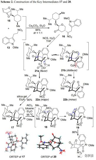 基于上述分析,作者首先探究了不對(duì)稱Michael加成反應(yīng)(圖3)。作者以烯酮15(由L-阿拉伯糖經(jīng)四步反應(yīng)制備,dr值>98:2)作為Michael受體,以此獲得有用的立體控制。經(jīng)過(guò)大量試驗(yàn)篩選,作者發(fā)現(xiàn)無(wú)機(jī)堿能極大地促進(jìn)吲哚片段13和二氫吡喃酮15的不對(duì)稱Michael加成,在優(yōu)化的條件下,以95%的收率制備目標(biāo)產(chǎn)物16,其為1:1的非對(duì)映異構(gòu)體混合物。隨后,作者嘗試通過(guò)連續(xù)的串聯(lián)氧化和羥醛環(huán)化引入螺-N-甲氧基吲哚酮的季碳手性中心。作者認(rèn)為關(guān)鍵的環(huán)化反應(yīng)可能經(jīng)歷兩個(gè)不同構(gòu)型的過(guò)渡態(tài)(21a和21b)。過(guò)渡態(tài)21b中硝基和苯環(huán)之間具有較大的空間位阻,因而過(guò)渡態(tài)21a是更有利的,這將使得環(huán)化產(chǎn)物的構(gòu)型與天然產(chǎn)物一致。此外,硝基和羥基之間穩(wěn)定的氫鍵相互作用也有利于形成中間體21a。令人高興的是,在N-氯琥珀酰亞胺和水的條件下,2-氯吲哚經(jīng)水解形成羥吲哚,其同時(shí)經(jīng)歷羥醛環(huán)化專一地產(chǎn)生單一異構(gòu)體氧雜二環(huán)[3.3.1]-壬烷17,產(chǎn)率為90%。值得注意的是,利用硅膠和三乙胺進(jìn)行淬滅是硝基異構(gòu)化后形成熱力學(xué)更穩(wěn)定的異構(gòu)體17的關(guān)鍵。制備大量的17之后,作者繼續(xù)探索了關(guān)鍵的pinacol重排反應(yīng),經(jīng)過(guò)廣泛的條件優(yōu)化,最終發(fā)現(xiàn)17在氯化鋁和甲苯/Et2O(10:1,v/v)的混合物中加熱回流能以30 mmol規(guī)模一次性得到酮20(8.6 g),產(chǎn)率為86%。氯化鋁/醚絡(luò)合物使得該重排反應(yīng)尤其高效,可能是由于其溫和的路易斯酸性,單獨(dú)使用氯化鋁會(huì)導(dǎo)致17完全分解。